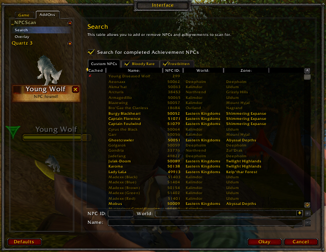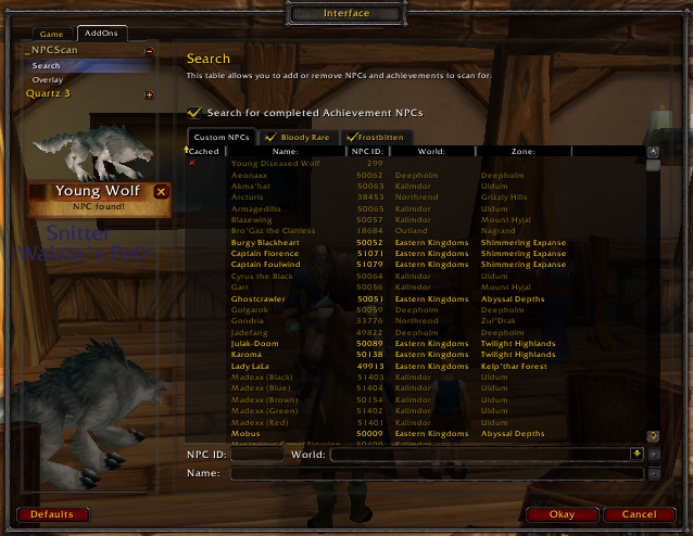 NPCScan for Diseased Young Wolf (NPC ID 299) still goes off on my pet, and the Young Wolves in Elwynn. Wowhead still has their diseased skin as the screenshot. I know I did mistype Diseased Young Wolf as Young Diseased Wolf in my NPCScan. Hush. >.>