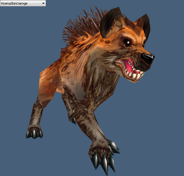 ~Blisterpaw Hyena is the only hyena that uses hyenaskin. While this is unique, it's so hard to tell this skin from the very similar hyenaskinoarnge. The differences between these skins, while subtle, can be seen here with this gif image. Yus, hyenaskinoarnge does misspell orange like that in the MPQ files.