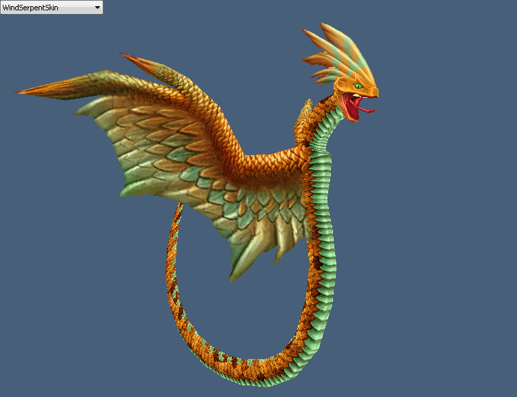 ~Two wind serpent skins, windserpentskin and windserpentskinoarnge, are extremely similar. This animated gif shows the differences between the two skins. Most yellow wind serpents in game use the windserpentskin. Only Deviate Coiler Hatchling uses the misspelled windserpentskinoarnge.