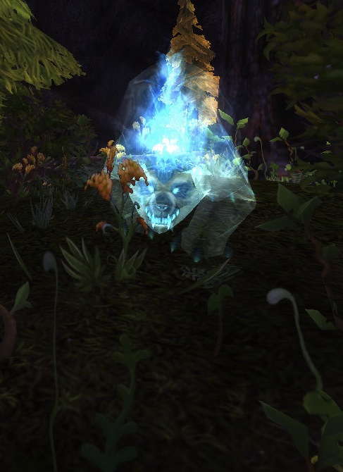that puppy. Cyfaillid; no, that's the Silithid Ravager, and will probably no longer be tamable once my stables expand (I wasn't particularly well-informed with Cataclysm news at the time). So, that leaves me with Fonlithien (Ghamoo-ra) and Argolak (Rotting Agam'ar) as the pets I can afford to abandon. Since Fonlithien is my soloing pet, and I do a lot of soloing, that leaves me with Argolak. So, I pick Argolak and close the stables window, and respond on the general channel. I quickly get invited to a group, and flew over to the priest's location. Abandon Pet, Freezing Arrow, Tame Beast; the tame itself was uneventful. I then proceeded to spend the next half hour or so running around, zapping critters with Spirit Strike, and then using Eyes of the Beast to run around and zap flagged NPCs with Spirit Strike. I later named him Aquind, after my brother's first character (a druid) that he had deleted at some point because neither of us knew how to drop professions. Maybe Aquind had gone off to help with Vordrassil, then some terrible accident occurred that left part of him roaming Grizzly Hills as a feral spirit? At any rate, Aquind has since been with Cialbi through a lot, becoming one of Cialbi's key pets even after his stables were expanded. I doubt that Cialbi will ever tame another Spirit Beast, because he will always be relying upon Aquind.