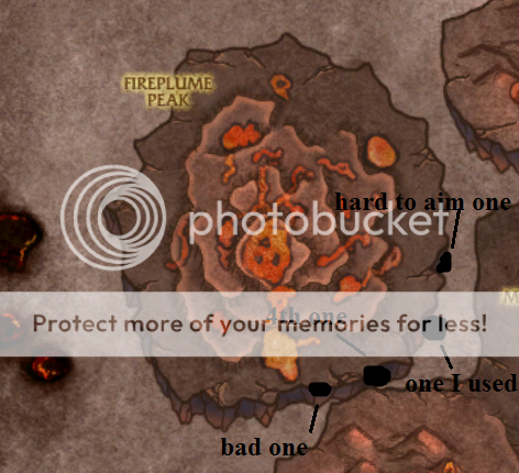 Now that you know the basic method Ill tell you how I got him and the 2 min buff that helps you out with this. On Fireplume Peak there are air vents that cause you to jump high. Well there are a few special one that if u jump from and land on Fireplume Peak you get a 2 min buff (http://i713.photobucket.com/albums/ww13 ... Skarr4.png) I've found 4 (http://i713.photobucket.com/albums/ww13 ... Skarr1.png) of theses vents. One of them isn't worth bothering with as you have to jump off of Fireplume Peak to use it, one of them is hard to aim and use, but the other two are the ones you want to know about. The one I used (http://i713.photobucket.com/albums/ww13 ... Skarr5.jpg) is, IMO the best spot to be to camp him, alliance cant get to you and u are with in jumping distance of both span points. I recommend practicing jumping with theses air vents, the better you get at aiming with them the better off you'll be.