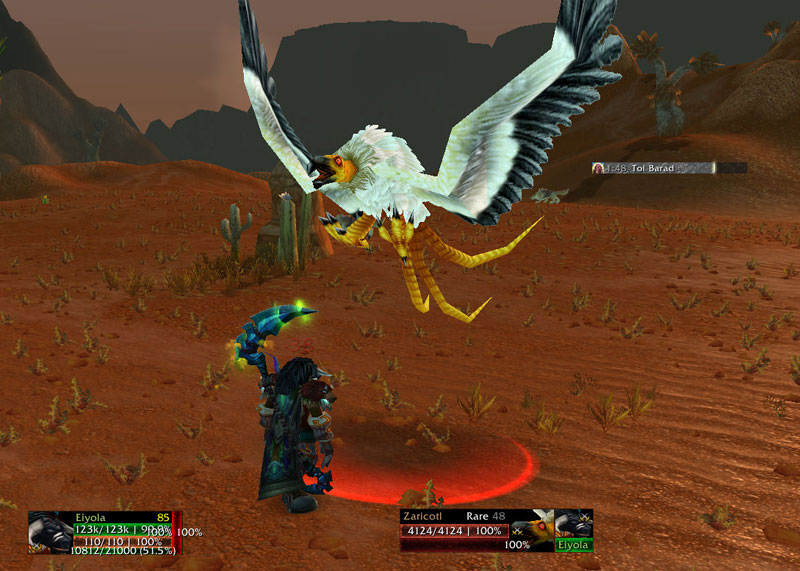 Back in 4.0.6 I greeted the arrival of a unique skin for Zaricotl with a general lack of enthusiasm. I always thought Zaricotl was an awesome mob back in vanilla (my enjoyment was probably improved somewhat by being good at NOT getting my lowbies eaten by him) and new skins are an unceasing source of joy, but... it's only a carrion bird. And I was pretty fond of the old red color, and all the screenshots of the new skin looked hideous to me. I was happy for people who wanted it and got it, but I had no interest for myself.