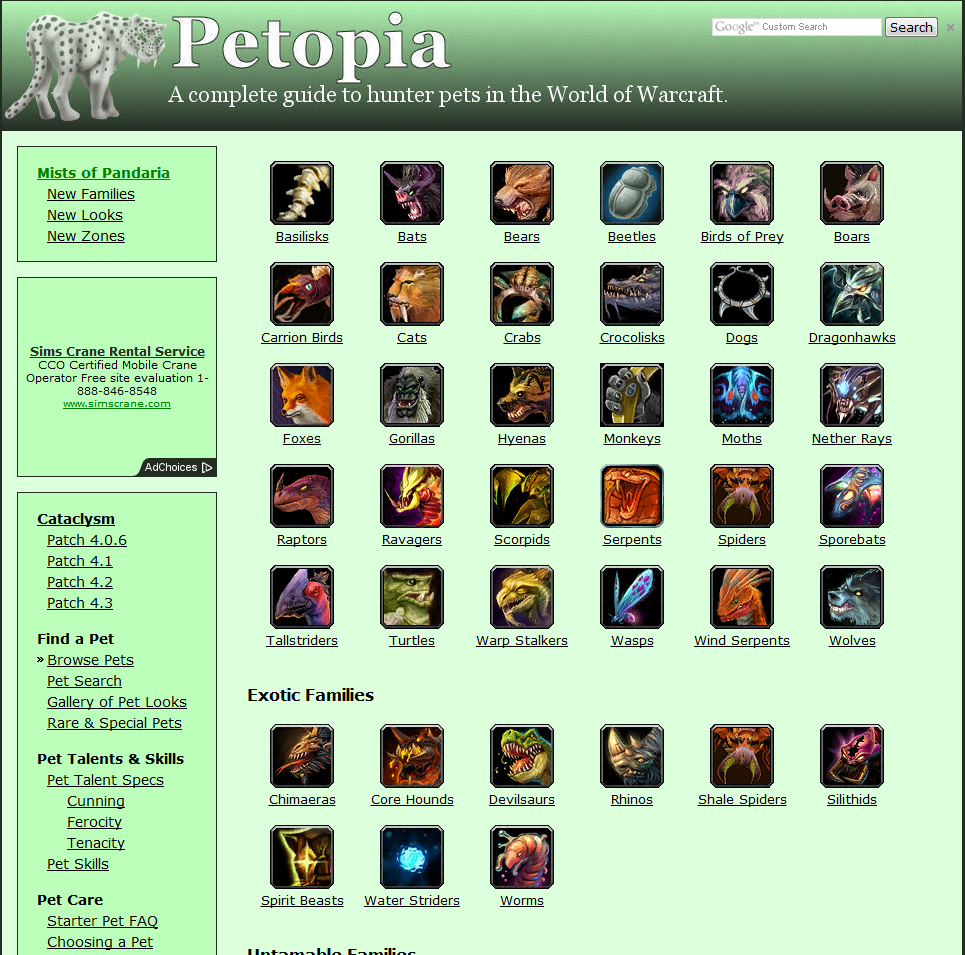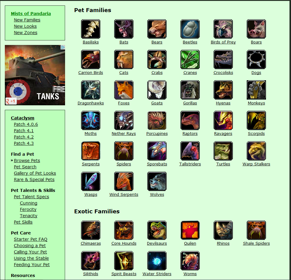 As pets can be any spec now, organizing them by spec is less useful. I suggest the front page be organized alphabetically (with perhaps a separate section for exotics), and the pet skills be organized by type within sections for buffs, debuffs, and utilities.