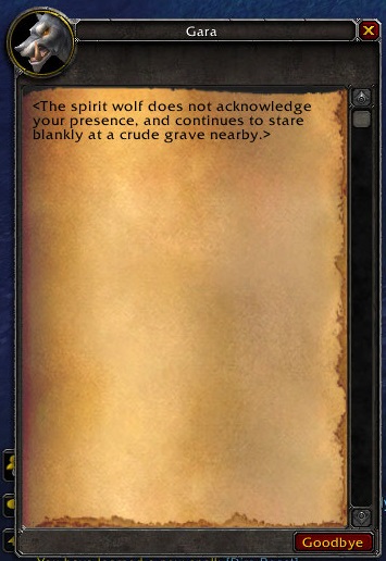 At The Burial Fields in Shadowmoon Valley there's a spirit wolf named Gara lying with some graves and the entire thing is terribly depressing and is making me cry but it's very interesting in that you can interact with her, but you can only scratch her behind the ears in Beast Mastery spec. Now, I have only tried Beast Mastery and Marksmanship, but I'm assuming this is a BM Hunter only thing and I would love to see other classes/specs test this out. So far nothing happens when I scratch her behind the ears. I've tweeted Jeremy about this and I'm hoping to get some clues from him. :lol: I've been running around The Burial Grounds a lot just because I feel like there's a lot of mysterious things going on and today is the first time I've ever seen Gara.