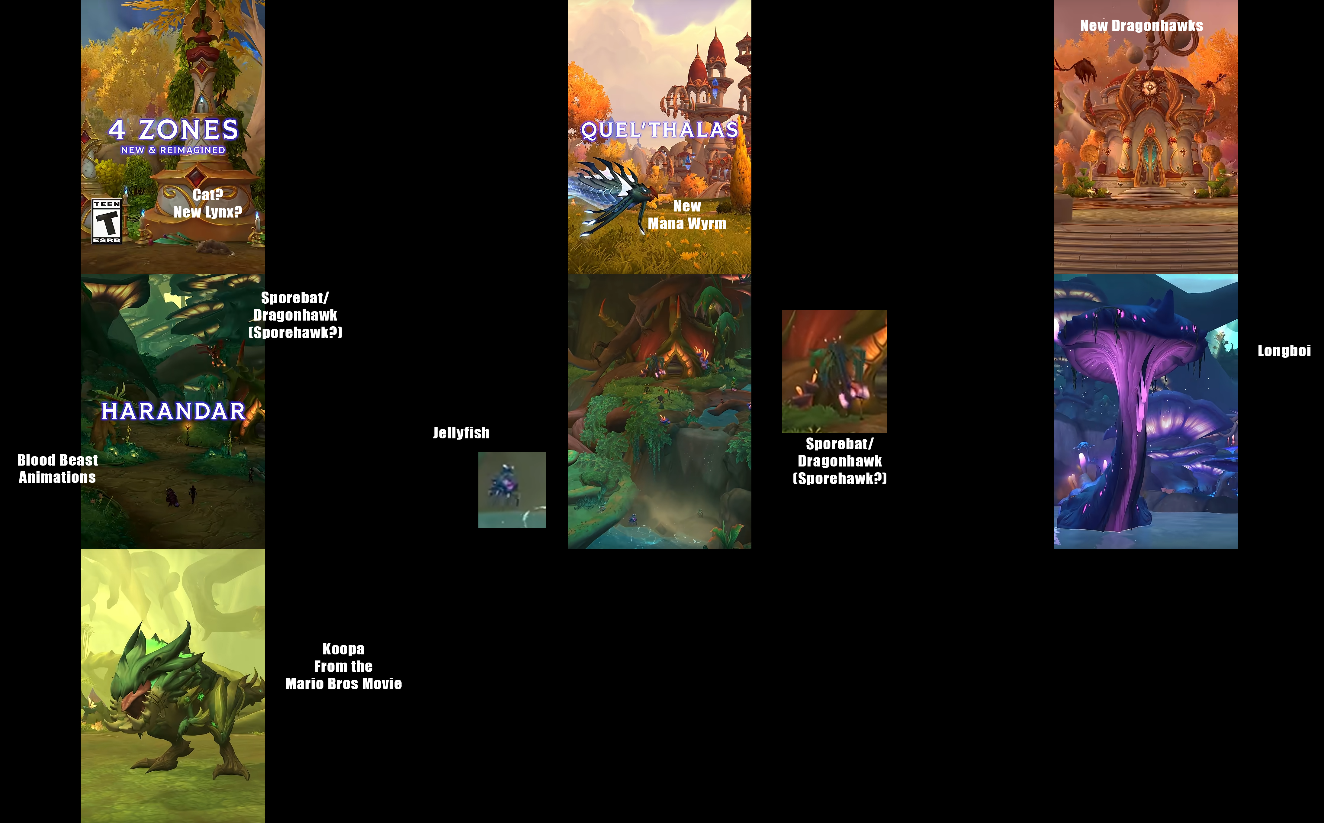 I saw and posted about most of those. I didn't notice the cat in Eversong, the blood beast, or the flying creature in the Void. The reptile cat/wolf thing is seen in another picture standing next to the new void hydra. I'm going to move my pics over to here: